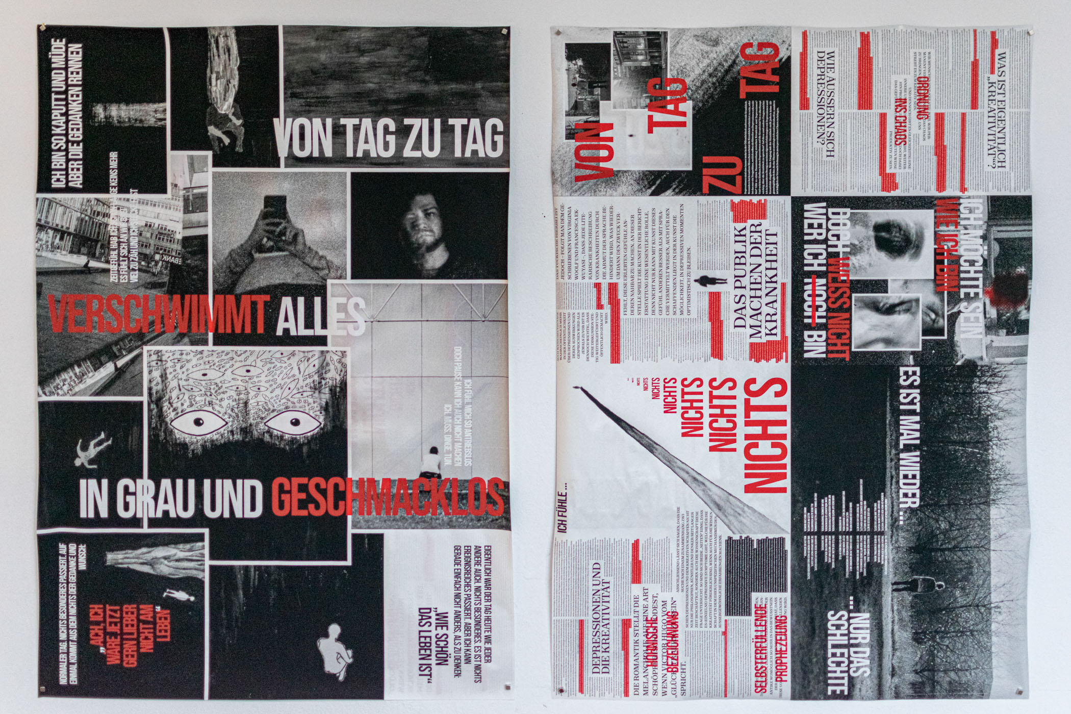 Depressionen erhalten in der Öffentlichkeit zunehmend mehr Aufmerksamkeit, insbesondere im Zusammenhang mit kreativen Personen. Doch ist dies nur ein Trugschluss, da ich selbst als Künstler an Depressionen leide? Besteht ein Zusammenhang zwischen Kreativität und Depressionen, und ist es überhaupt wichtig, über diese Krankheit zu sprechen? ‚Von Tag zu Tag‘ ist eine Zeitung, die sich mit meinen persönlichen Erfahrungen mit Depressionen und Kreativität auseinandersetzt. Ziel ist es, das Bewusstsein für Depressionen zu stärken und Aufklärung darüber zu betreiben.